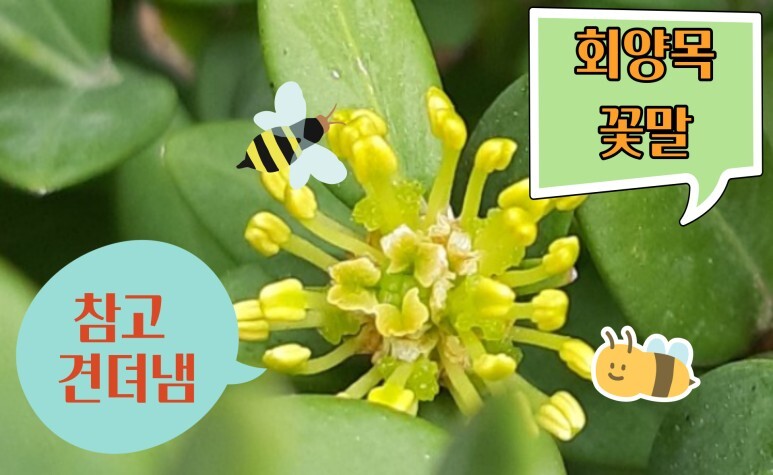 회양목은 회양목과에 속하는 작은 상록활엽관목으로 한국의 산지에서 많이 자라는데 특히 석회암지대의 산기슭과 산중턱에서 많이 자라며 정원수 등으로도 많이 심고 있습니다. 회양목 꽃은 꽃잎이 없이 4~5월에 엷은 황색으로 가지 끝이나 잎겨드랑이에서 암꽃과 수꽃이 나와 모여 피는데 중앙에 암꽃이 있습니다.