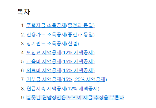 지금부터는 앞에서 본 소득공제와 세액공제 중 주요제도들을 위주로 공제 내용을 알아보자.