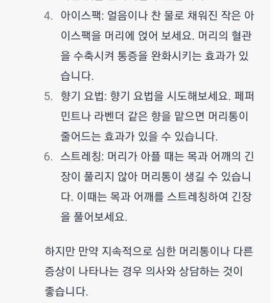 휴식: 머리가 아플 때는 휴식이 가장 중요합니다. 누워서 쉬거나, 눈을 감고 몇 분간의 명상을 시도해보세요.