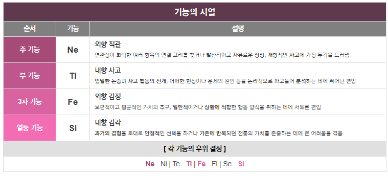 주기능인 Ne(외향 직관)으로 인해 두뇌 회전이 빠르며 사안에 대한 직관력을 발휘해 대략적인 이해가 매우 뛰어나다.