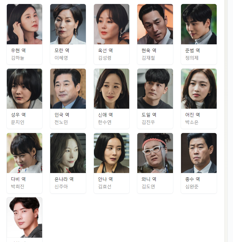 인물관계도를 살펴보자면, 세 배우 이외에도 다채로운 출연진을 자랑한다. 김재철, 정의제, 문지인, 전노민, 한수연, 김진우, 박소은, 박희진, 신주아, 김효선, 김도연, 심완준 등의 여러 배우들이 함께 했다.