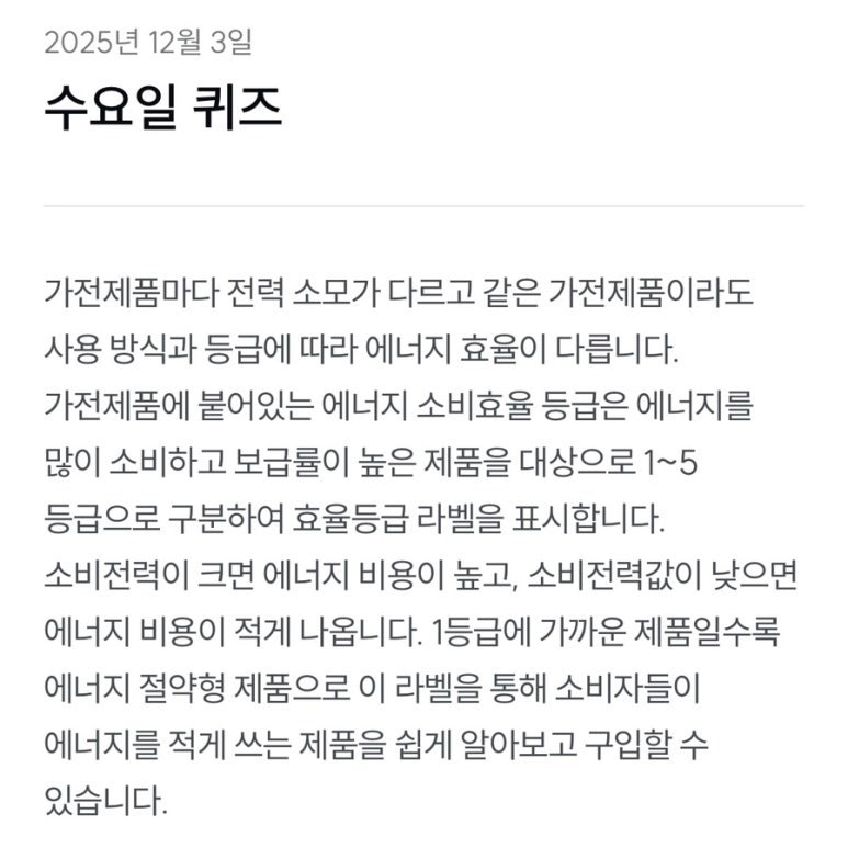 요즘 날씨가 부쩍 추워지면서 난방비 걱정도 슬슬 시작되죠? 이럴 때일수록 전기 사용량을 줄이는 똑똑한 소비 습관이 필요해요. 그래서 오늘은! 🌱 기후동행퀴즈 12월 3일자 문제를 중심으로, 우리가 실천할 수 있는 기후행동퀴즈 이야기를 살짝 발랄하게 풀어볼게요.