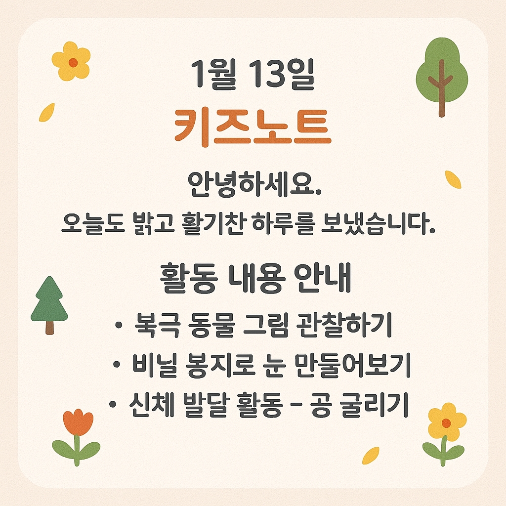 🌈 1월 13일 키즈노트 인사말 & 활동 내용 (연령별) 🌈