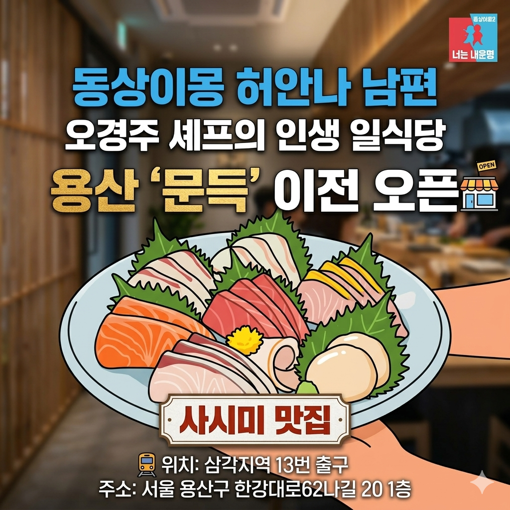 안녕하세요! 오늘은 많은 분이 기다리셨던 반가운 소식을 들고 왔어요. 바로 SBS '동상이몽2 - 너는 내 운명'에서 허안나 님의 든든한 지원군이자 섬세한 손길의 주인공, **오경주 셰프님의 일식당 '문득'** 이야기입니다.