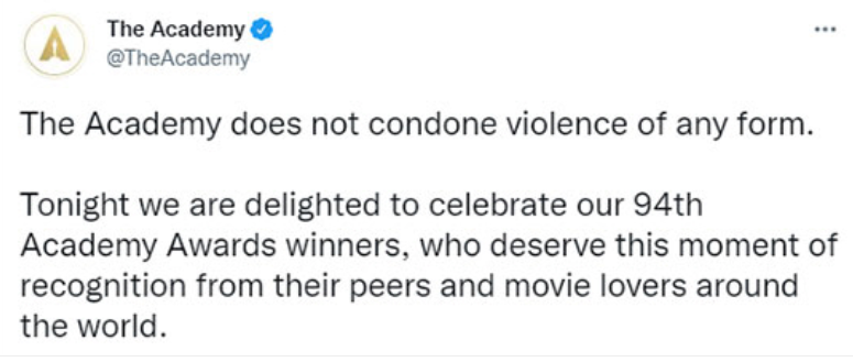 아카데미는 어떤 이유에서도 폭력은 허용하지 않는다는 자막이 올라왔다.