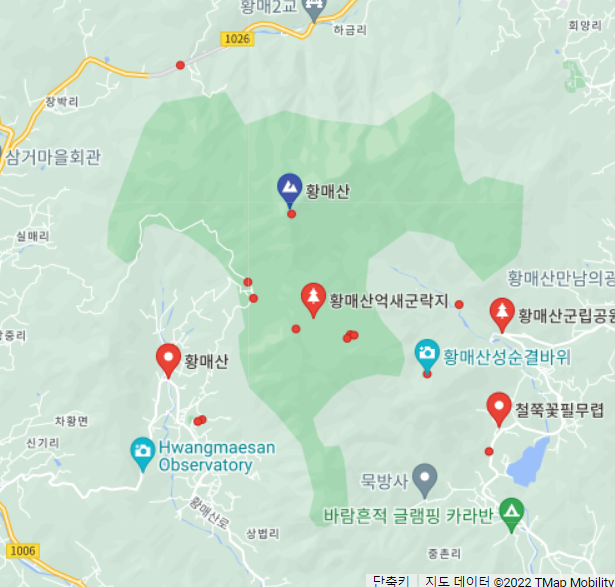 철쭉 군락지인 정상 바로 아래는 과거 목장을 조성했던 평원으로 구릉진 초원이 이국적인 풍경을 자아내며, 황량한 겨울을 이겨낸 초목과 붉은 꽃의 조화가 끝없이 펼쳐진 산상화원의 모습이야말로 황매산 철쭉 산행의 백미입니다.