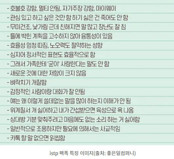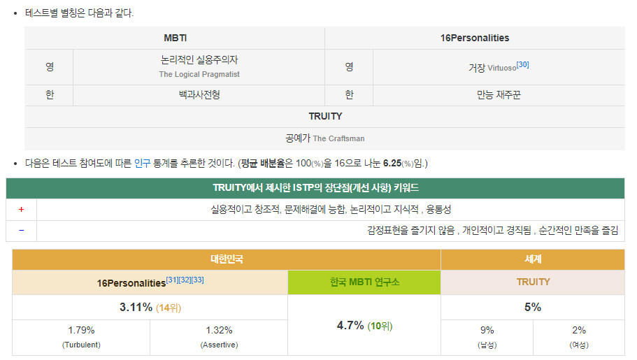 성격 유형 검사(MBTI, 16 Personalities, TRUITY 등)에서 통용되는 16가지 유형 중 ISTP 유형을 설명하는 문서.