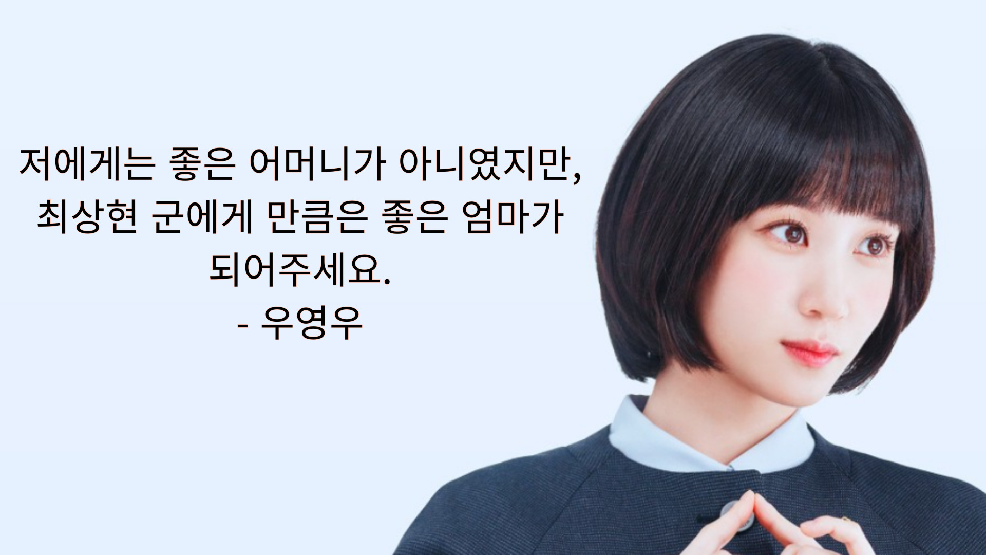 하지만 우영우 변호사는 정명석 변호사가 아니잖아요. 나랑은 완전히 다른 사람인데 내가 무슨 조언을 하겠어요. 난 그저 우영우 변호사의 결정이 궁금할 뿐이에요. 우영우 변호사는, 음... 그냥 보통 변호사가 아니니까.