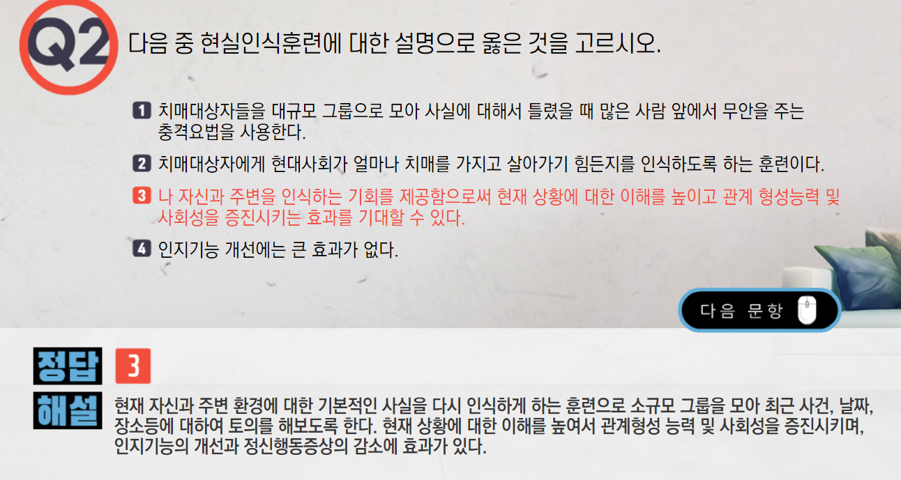 | 치매전문교육 강의 시험문제 및 중심강의1 (0) | 2022.09.01 |