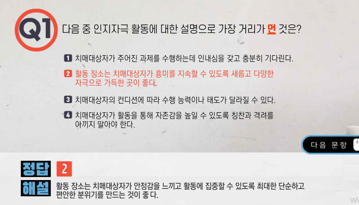 치매전문교육 시험문제[인지활동자극실제2] (1) | 2022.09.03 |