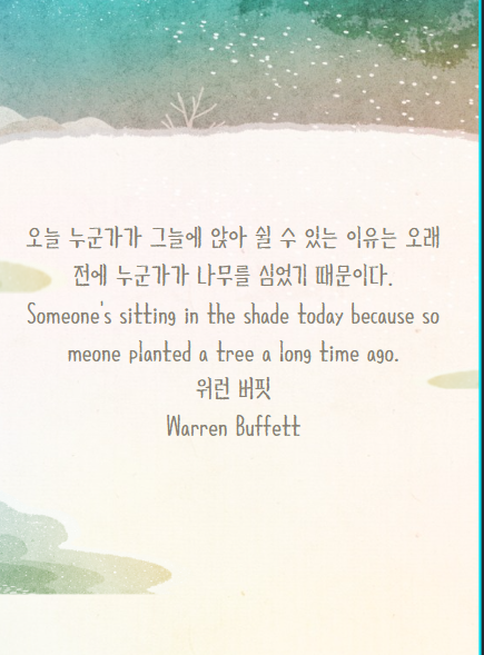 오늘 누군가가 그늘에 앉아 쉴 수 있는 이유는 오래 전에 누군가가 나무를 심었기 때문이다.