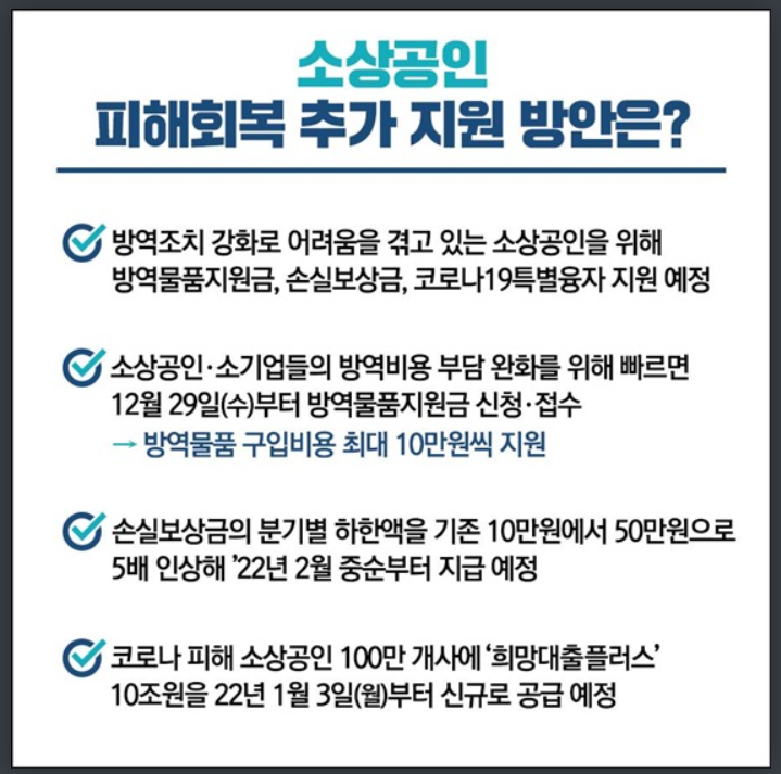 - 방역조치 강화로 어려움을 겪고 있는 소상공인을 위해 방역물품지원금, 손실보상금, 코로나19특별융자 지원 예정